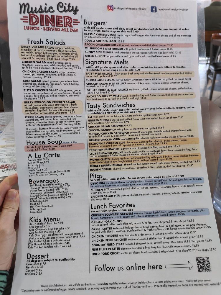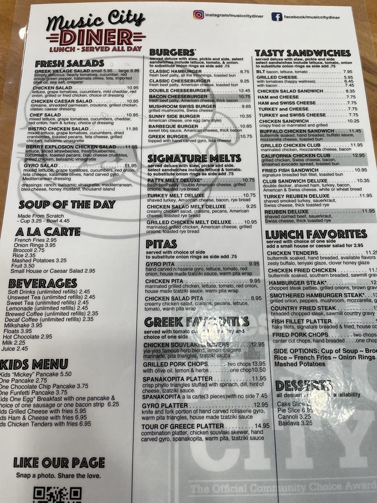 “ We enjoy visiting Music City Diner, on the occasion that we are in the area. They serve delicious Greek Gyros and Greek Salads, as well as home made soup. Their pancakes are thick, fluffy, and very tasty, too. A note for our future visits: the house made corned beef hash is not bad, but not our preference, and so we should focus on other choices. ”